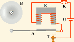 Простейшим примером релаксационных автоколебаний может служить работа электрического звонка, изображённого на рис. 3. Источником постоянного (непериодического) воздействия здесь является электрическая батарея U; роль нелинейного регулятора выполняет прерыватель T, замыкающий и размыкающий электрическую цепь, в результате чего в ней возникает прерывистый ток; колеблющимися элементами являются магнитное поле, периодически наводимое в сердечнике электромагнита E, и якорь A, движущийся под воздействием переменного магнитного поля. Колебания якоря приводят в действие прерыватель, что и образует обратную связь.