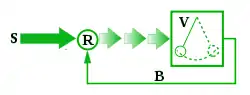 На схеме: S — источник постоянного (непериодического) воздействия; R — нелинейный регулятор, преобразующий постоянное воздействие в переменное (например, в прерывистое во времени), которое и «раскачивает» осциллятор V — колеблющийся элемент (элементы) системы, а колебания осциллятора через обратную связь B управляют работой регулятора R, задавая фазу и частоту его действия. Диссипация (рассеивание энергии) в автоколебательной системе возмещается за счёт поступления в неё энергии из источника постоянного воздействия, благодаря чему автоколебания не затухают.