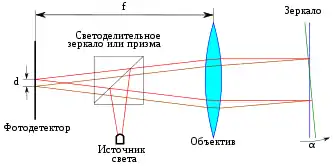 На детекторе объективом сфокусирован в маленькое пятно точечный источник света. Если объект вместе с зеркалом наклоняется на угол , то пятно смещается на расстояние . При этом и и фокусное расстояние объектива связаны соотношением:
