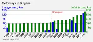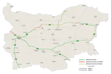 Первые планы по строительству автомагистралей появились в 1973 году, когда правительство Народной Республики Болгария дало разрешение на строительство кольца, к которому подходили три автомагистрали — «Фракия», «Хемус» и «Черно Море»[5]. К 1990 году было построено 273 км автомагистралей[6], а к 2007 году (вступлению в ЕС) расширилось до 420 км за счёт государственного финансирования[6]. Использование фондов ЕС позволило Болгарии ускорить строительство: к 10 ноября 2020 года было построено 830 км автомагистралей, ещё 141,59 км строились.