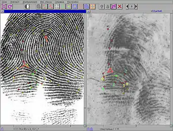 - Дактилоскопическая идентификация — использование дактилоскопии для получения криминалистических улик и доказательств. Дактилоскопическая идентификация позволяет установить и доказать факт того, что след пальца или ладони руки оставлен именно конкретным лицом.