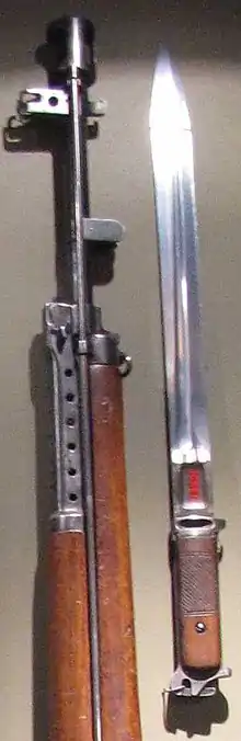 Ствол винтовки имел массивный дульный тормоз и крепление для штыка-ножа. На ранних выпусках АВС штык мог примыкаться не только горизонтально, но и вертикально, клинком вниз. В таком положении его предполагалось использовать в качестве одноногой эрзац-сошки для стрельбы с упора. Однако уже изданное в 1937 году исправленное описание винтовки это категорически воспрещает, предписывая вместо этого вести автоматический огонь из положения лёжа с упора в виде скатки или дёрна. Там же указывается, что со второй половины 1936 года комплектовать винтовки штыком-сошкой прекратили[5]. Очевидно, данная идея, в теории выглядящая привлекательной, на практике себя не оправдала. В походном положении штык переносился в ножнах на поясе бойца и при стрельбе, в отличие от винтовки обр. 1891/30 г.г., не примыкался. Открытый прицел был насечен по дальности от 100 до 1 500 метров с шагом 100 метров.
