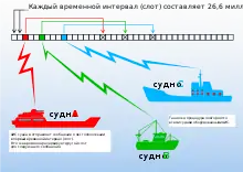 Работа каждой станции АИС (мобильной или базовой) жёстко синхронизирована по времени UTC с погрешностью не более 10 мкс от встроенного приёмника ГНСС (в РФ по сигналам комбинированного приёмника ГНСС ГЛОНАСС/GPS). Для передачи информации используются непрерывно повторяющиеся кадры длительностью 1 минута, которые разбиваются на 2250 слотов (временных интервалов) длительностью по 26,67 мс.