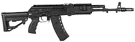 - изменённое цевьё из стеклонаполненного полиамида, имеющее длинную планку Пикатинни на нижней стороне и съёмные короткие на правой и левой стороне и антабка ремня, устанавливаемая на эти планки, аналогичные таковым у АК-РМО;