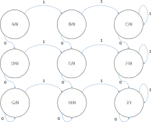 - Диаграмма — изображённый на плоскости ориентированный граф, вершины которого взаимно однозначно соответствуют состояниям автомата, а дуги — входным символам.