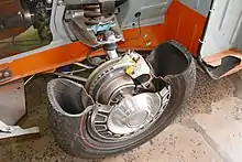 В общепринятой в отечественном автомобилестроении терминологии колесом называется только узел, расположенный между шиной и ступицей, но без самой шины, состоящий, в свою очередь, из обода, на который сажается шина, и диска или спиц, служащих для соединения обода со ступицей. Шина, в свою очередь, включает в себя покрышку, камеру (для камерных шин) и ободную ленту (например, в велосипедных колёсах).[1] В этой статье данная терминология не соблюдается.