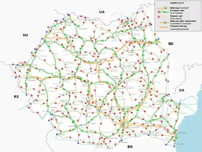 В настоящее время сеть автомагистралей Румынии считается наименее развитой по сравнению с другими странами Европейского Союза; в декабре 2009 года протяженность используемых магистралей составляла всего 321 км.[1] Тем не менее, разработан план развития сети автодорог, многие пункты из которого уже строятся; значительные положительные изменения дорожной инфраструктуры Румынии запланированы к осуществлению в 2015 году.