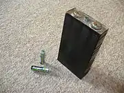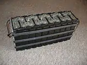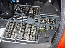 | Электропитание автомобиля с электроприводом («Hotzenblitz») осуществляемое при помощи 14 никель-металлогидридных аккумуляторных батарей напряжением 12 В и ёмкостью 78 А·ч и состоящих каждая из 10 призматических аккумуляторов напряжением 1,2 В | ![]() |