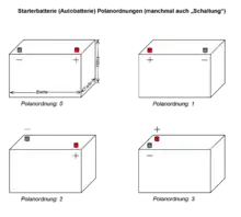 «Обратная» или «прямая». Определяет расположение электродов на корпусе автомобильной АКБ. Для автомобилей отечественного выпуска характерна прямая полярность, при которой плюсовая клемма находится слева, а минусовая — справа, при положении аккумулятора «клеммы ближе к вам». Установить чужую батарею, например «европейскую» на японский автомобиль, зачастую бывает невозможно. Может потребоваться удлинение проводов.