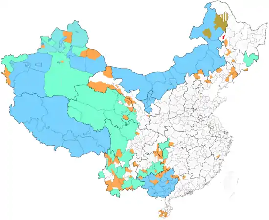Из признанных 55 этнических меньшинств 44 имеют автономные территории. Площадь всех автономных территории занимает около 64% всей территории страны.
