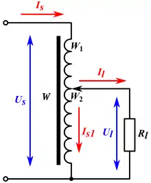 Однако ток в верхней части обмотки автотрансформатора, имеющей число витков будет отличаться от тока в нижней её части, имеющей количество витков . Это объясняется тем, что в верхней части обмотки протекает только ток , а в нижней части — некоторый результирующий ток, представляющий собой разность токов и . Дело в том, что согласно правилу Ленца индуцированное электрическое поле в обмотке автотрансформатора направлено навстречу электрическому полю, созданному в ней источником электрической энергии. Поэтому токи и в нижней части обмотки автотрансформатора направлены навстречу друг другу, то есть находятся в противофазе.