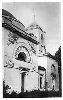 «Чтобы заключить надгробие Д. М. Полторацкого, похороненного у церковной апсиды, в пределы церкви, Стасов предложил расширить её алтарь. По окончательному проекту прежняя церковь сохраняла свои габариты. В. П. Стасов сам заказывал в Петербурге мраморные памятники и иконы, сделал проект иконостаса и следил за ходом работ, которые вел итальянский архитектор Луиджи Пелли. Церковь приобрела ампирный вид, украсилась барельефами летящих слав». По сообщению Осоргина, под церковью был фамильный склеп.