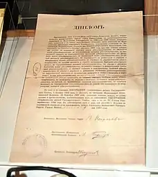 Диплом Московского университета, вручённый 16 октября 1901 с подписью попечителя Московского учебного округа П. Некрасова