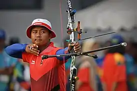В мужском командном турнире команда Индонезии набрала 1962 очка за 216 выстрелов в рейтинговом раунде, показав десятый результат из двенадцати команд. В 1/8 финала индонезийцы встретились с Китайским Тайбэем, занявшим седьмое место. Одержав победу в двух сетах, а два других сведя вничью, Индонезия выиграла 6:2[8]. В четвертьфинале они встретились со сборной США, показавших второй результат в рейтинговом раунде. Несмотря на то, что после двух сетов счёт был равным, Брейди Эллисон, Зак Гарретт и Джейк Камински выиграли два сета подряд и вышли в следующий раунд, а индонезийцы завершили выступления[9].