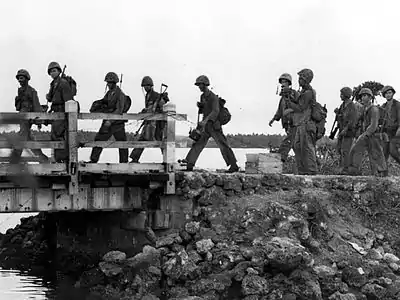 Морские пехотинцы США переходят мост в Агате во время освобождения Гуама в 1944 году