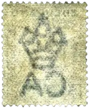 ![]() «Корона и CA» (англ. «Crown & CA», от «Crown Agents» — «Агенты короны») — типичный водяной знак на почтовых марках британских колоний в 1880-х — 1920-х годах | |
