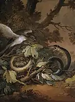 Натюрморт со змеей и птичьим гнездом. Дерево, масло