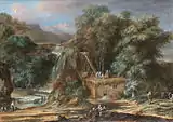 Речной пейзаж с фигурами, строящими акведук у водопадов, восточными фигурами и верблюдами поблизости. Холст, масло