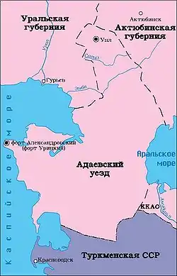 Адаевский уезд в составе Туркестанской АССР был образован 12 июня 1920 года. Постановлением ЦИК КазАССР от 25 октября 1920 года. этот уезд был передан в состав Киргизской (с 1925 года — Казакской) АССР. Одновременно к Адаевскому уезду были присоединены Мангышлакский уезд и 4-я и 5-я Адаевские волости Красноводского уезда Закаспийской области. Находясь в составе Киргизской АССР Адаевский уезд имел права губернии и делился на 25 кочевых волостей. Центром уезда был назначен форт Александровский (с 2 сентября по 10 ноября 1924 года назывался форт Урицкий), а с 19 февраля 1925 по 13 мая 1926 года центр временно переносился в Уил[1].