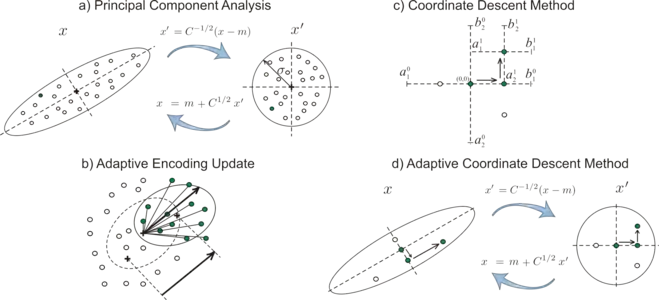 CMA-подобное адаптивное кодирование (b), в основном базирующееся на методе главных компонент (a), используется для расширения метода координатного спуска (c) для решения неразделимых задач оптимизации (d).