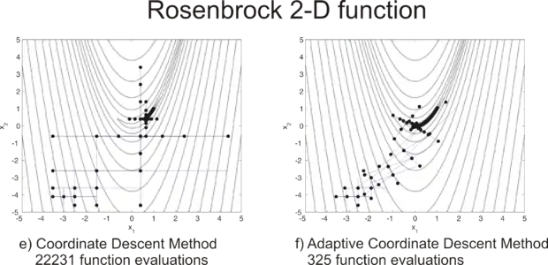 Адаптация приемлемой координатной системы позволяет методу адаптивного координатного спуска превзойти координатный спуск на неразделимых функциях. Следующий рисунок показывает сходимость обоих алгоритмов для двумерной функции Розенброка до целевого значения функции начиная с точки .