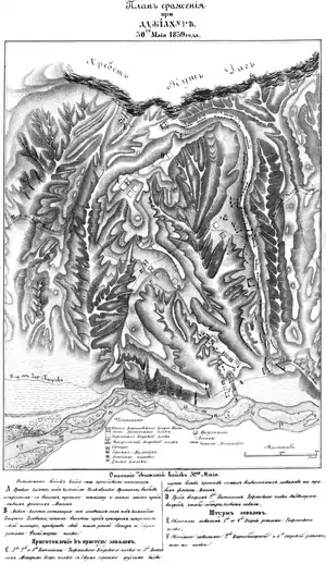 По всему гребню гор были устроены неприятелем большие завалы из камней с тем, чтобы скатывать их при наступлении атакующих по единственной пешеходной тропе, могущей только с большим затруднением служить для движения вьюков. За завалами засело до 6000 человек лезгин, готовых к упорному сопротивлению.