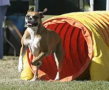 Туннель изготовлен из тезы, натянутой на расположенные на равном расстоянии ребра жесткости или сплошную спираль. Туннели могут быть длиной от трех до шести метров и 60 см в диаметре. Собака должна пробежать сквозь туннель. По усмотрению судьи туннель может быть расположен на трассе прямо, либо быть загнутым в форме подковы. Однако правилами запрещено расположения туннелей в форме буквы «S». Чтобы избежать изменения конфигурации туннеля во время преодоления собакой, его укрепляют утяжелителями (мешками с песком или водой).[10]