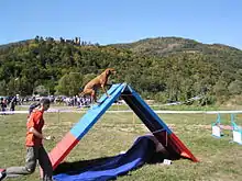 Два широких трапа (90 на 270 см), соединённых вместе и поднятых так, чтобы высота в месте соединения была 170 см от земли, в форме угла. 106 см от земли вверх трап красят в яркий цвет, обозначая так называемую контактную зону, которой собака должна коснуться хотя бы частью одной лапы при входе и сходе со снаряда. Большинство организаций требует, чтобы у горки были узкие, горизонтальные планки по всей длине составляющих её трапов, чтобы обеспечить лучшее сцепление.[10]