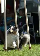 12 вертикальных палок, зафиксированных в металлической основе в одну линию на расстоянии 50 см, каждая 100—120 см высотой[10]. Собака должна пройти между палками «змейкой», всегда начиная преодоление первого створа с левого плеча. Собака не должна пропускать стойки. Для большинства собак слалом — одно из самых трудных препятствий, он также является самым длительным по преодолению. Собака может получить штраф за некорректное выполнение входа в слалом (отказ), а также пять баллов штрафа за ошибку в слаломе, если пропустит один или несколько створов.