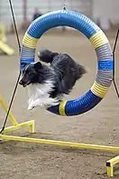 Кольцо, размером примерно с автомобильную покрышку, закреплённое в рамке. Собака должна прыгнуть сквозь отверстие в шине. Как и при других прыжках, высота меняется в зависимости от ростовой категории. Наиболее безопасными считаются «безрамные» раскрывающиеся пополам шины на магнитных элементах, состоящие только из нижней основы и самой шины, так как при неверном преодолении снаряда, он не обрушится на собаку и не причинит травму.