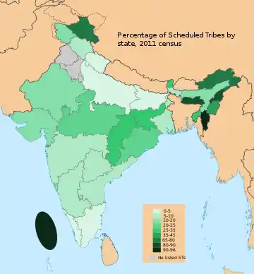 Племенные сообщества сконцентрированы в поясе, тянущемся вдоль Гималаев от Ладакха на западе, через Химачал-Прадеш и Уттаракханд до Ассама, Мегхалаи, Трипуры, Аруначал-Прадеша, Мизорама, Манипура и Нагаленда на востоке. В малонаселенных северо-восточных штатах племена, немногочисленные сами по себе, составляют более 90 % населения. Крупные племенные группы проживают в Джарханде, Западной Бенгалии и Ориссе на востоке. До 75 % общего племенного населения Индии обитает в центральных штатах, хотя в целом оно составляет не более 10 % населения этих густонаселенных штатов. Меньшие по численности племенные группы населяют южные штаты Карнатаку, Тамилнад и Кералу, западные Гуджарат и Раджастхан, союзные территории Лакшадвипу, Андаманские и Никобарские островов.