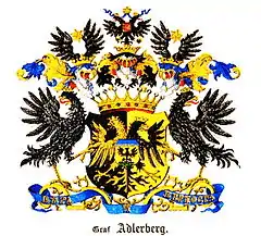 В щите, имеющем чёрное и золотое поле, двуглавый коронованный орёл, имеющий на груди щиток, в котором в золотом же поле, на зелёном холме, чёрный орёл. Глава этого щита лазуревая (гласный герб — Adler — орёл + berg — гора). Главный щит украшен графской короной и тремя графскими коронованными шлемами. Нашлемники: среднего шлема: возникающий императорский орёл, увенчанный тремя коронами и имеющий на груди червлёный с золотыми краями щит, в котором золотое же вензелевое изображение имени императора Николая I, а крайних шлемов — два черные орлиные крыла, между которыми золотая о пяти лучах звезда.