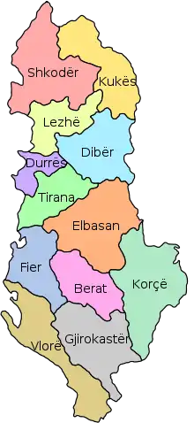 В административном отношении территория Албании делится на 12 областей (алб. qark, мн.ч. qarqe[1] [carce] / [кярк, кяркье[2]]), которые, в свою очередь, делятся на 61 муниципалитет, в состав которых входят коммуны (деревни). Ранее, до административно-территориальной реформы 2015 года, области делились на 36 округов (алб. rreth, мн.ч. rrethe, [reθ] / [реθ]), округа делились на 309 коммун (алб. komunë, мн.ч. komuna) и 65 городов (алб. bashki, опр.ф. bashkia, букв. «муниципальный совет»).