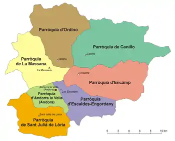 Андорра в административном отношении разделена на 7 общин[1][2] (кат. parròquies, ед. ч. кат. parròquia — «приход, паррокия»). Последняя, седьмая община — Эскальдес-Энгордань была образована в 1978 году.
