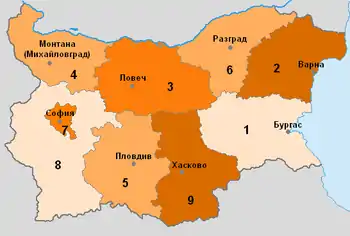 - Михайловградская область (с 1993 — Монтанская). Центр — Михайловград (в 1993 переименован в Монтану)