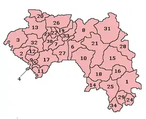Все регионы Гвинеи делятся на 33 префектуры: