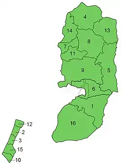 Частично признанное Государство Палестина (или Палестинская национальная администрация) состоит из 16 провинций (араб. محافظة — мухафаза, мн. — мухафазат): 11 на Западном берегу реки Иордан и 5 в Секторе Газа. Сектор Газа, де-факто, находится под управлением радикального движения Хамас.