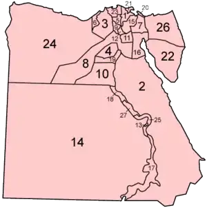 Египет административно разделен на 27 мухафаз, или провинций (ед.ч. — араб. محافظة muḥāfaẓä, мн.ч — араб. محافظات muḥāfaẓāt).