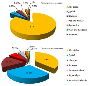 Абу-Даби | 67 340 | 1 548 655 | 23,00 | Является самым крупным по площади эмиратом в составе ОАЭ. Административный центр эмирата, город Абу-Даби также является столицей ОАЭ[3]. |
