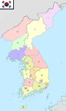 Хотя административно-территориальное деление Кореи менялось со временем, главные принципы современной трёхуровневой системы были заложены во время правления Коджона в 1896 году. Похожая система также сохраняется и в Северной Корее.