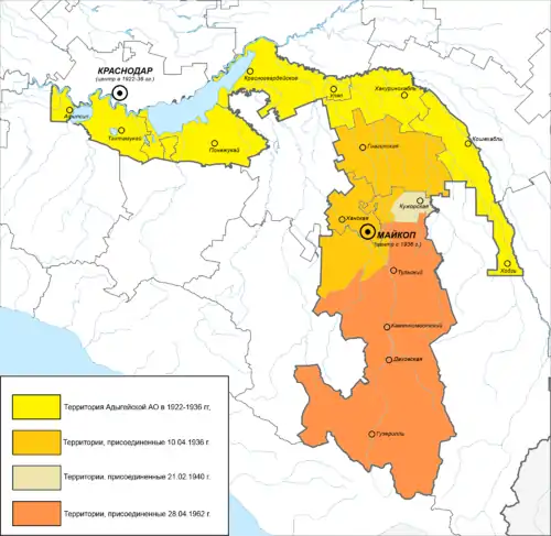 10 января 1934 года из Северо-Кавказского края был выделен Азово-Черноморский край, куда была отнесена Адыгейская АО. 28 декабря того же года на территории Азово-Черноморского края было проведено разукрупнение районов, в результате в Адыгейской АО число районов увеличилось до 5, а сельских советов с 40 до 43.