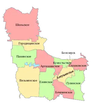 | городское поселение город Белозерск | Белозерск | город Белозерск, частично Глушковский сельсовет[10] и частично Куностьский сельсовет [15] |