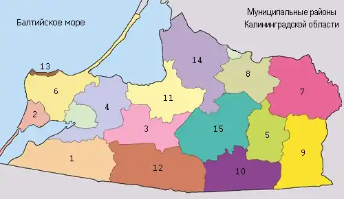 - 15 муниципальных районов (Багратионовский, Балтийский, Гвардейский, Гурьевский, Гусевский, Зеленоградский, Краснознаменский, Неманский, Нестеровский, Озёрский, Полесский, Правдинский, Светлогорский, Славский, Черняховский).