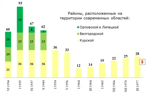 Постановлением ВЦИК «О новой районной сети Курской области» от 18 января 1935 года[7] была утверждена новая сеть районов. Были восстановлены практически все существовавшие ранее районы и созданы новые. Сформировано 92 района[7], 21 город (среди них Курск, Орёл и Белгород — города областного подчинения), 3 рабочих посёлка и 1 592 сельских Совета[8].