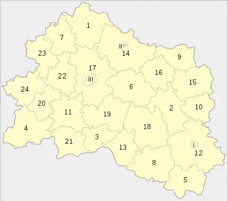 - 24 района (1 — Болховский, 2 — Верховский, 3 — Глазуновский, 4 — Дмитровский, 5 — Должанский, 6 — Залегощенский, 7 — Знаменский, 8 — Колпнянский, 9 — Корсаковский, 10 — Краснозоренский, 11 — Кромской, 12 — Ливенский, 13 — Малоархангельский, 14 — Мценский, 15 — Новодеревеньковский, 16 — Новосильский, 17 — Орловский, 18 — Покровский, 19 — Свердловский, 20 — Сосковский, 21 — Троснянский, 22 — Урицкий, 23 — Хотынецкий, 24 — Шаблыкинский)