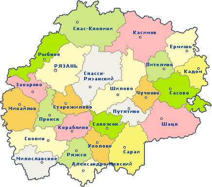 - 8 городов районного значения (Кораблино, Михайлов, Новомичуринск, Рыбное, Ряжск, Спас-Клепики, Спасск-Рязанский, Шацк),