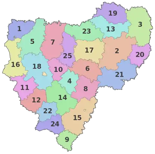 - 25 городских населённых пунктов, из которых 15 городов (включая 2 города вне состава районов и 13 городов в составе районов) и 10 посёлков городского типа,