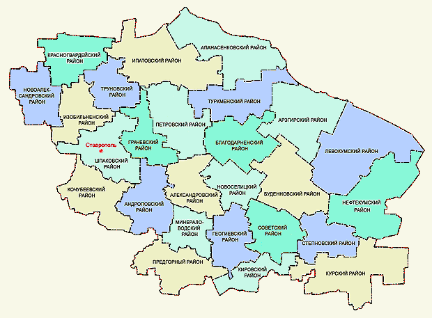 - 26 районов (Александровский, Андроповский, Апанасенковский, Арзгирский, Благодарненский, Будённовский, Георгиевский, Грачёвский, Изобильненский, Ипатовский, Кировский, Кочубеевский, Красногвардейский, Курский, Левокумский, Минераловодский, Нефтекумский, Новоалександровский, Новоселицкий, Петровский, Предгорный, Советский, Степновский, Труновский, Туркменский, Шпаковский)