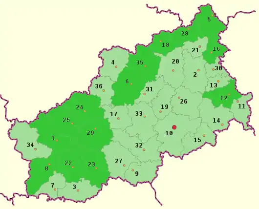 - районы — Андреапольский, Бежецкий, Бельский, Бологовский, Весьегонский, Вышневолоцкий, Жарковский, Западнодвинский, Зубцовский, Калининский, Калязинский, Кашинский, Кесовогорский, Кимрский, Конаковский, Краснохолмский, Кувшиновский, Лесной, Лихославльский, Максатихинский, Молоковский, Нелидовский, Оленинский, Осташковский, Пеновский, Рамешковский, Ржевский, Сандовский, Селижаровский, Сонковский, Спировский, Старицкий, Торжокский, Торопецкий, Фировский;