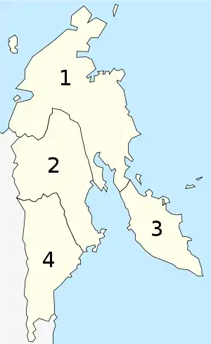 Уезды: 1. Акланский, 2. Ижигинский, 3. Нижнекамчатский, 4. Охотский